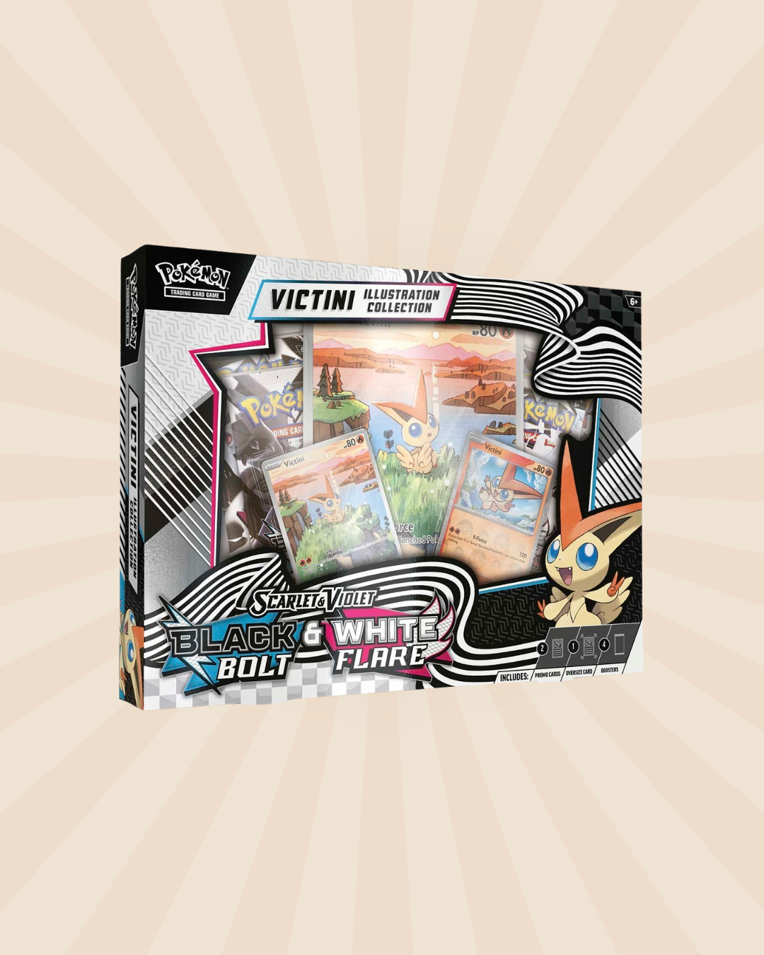 The Mythical Pokémon Victini is said to create infinite energy that it can share with its friends, and now you can team up with it in your own Pokémon TCG decks! In this collection, you get an illustration rare-style foil promo card and a premium parallel foil card featuring Victini, along with an oversize card for display. You’ll find even more Pokémon from the Unova region inside the included booster packs from the special Scarlet & Violet—Black Bolt and Scarlet & Violet—White Flare expansions.
