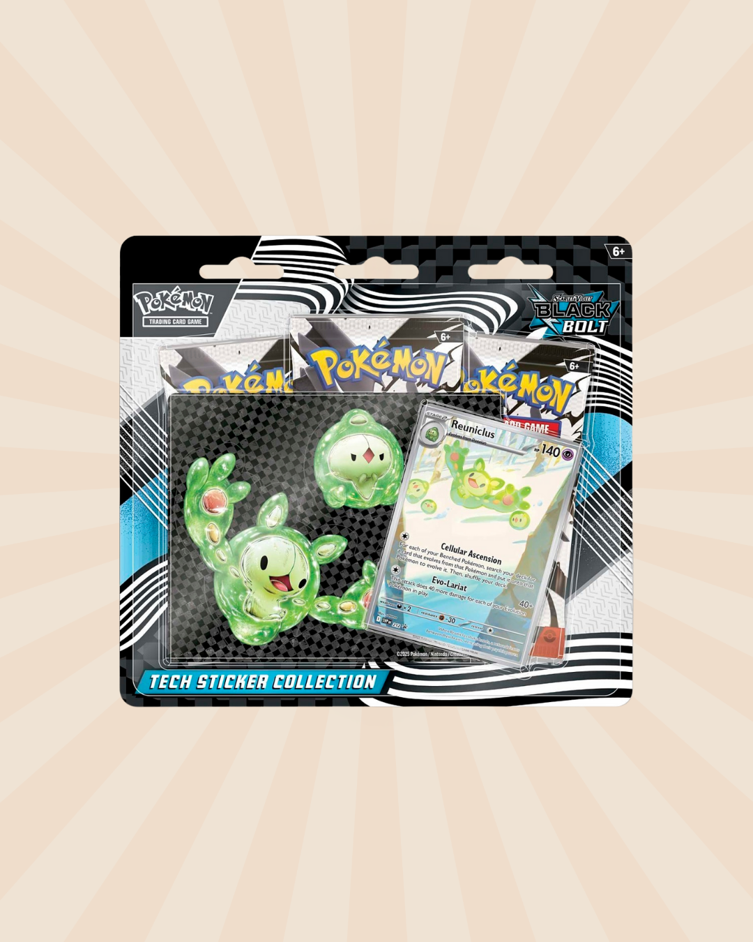 Versier je laptop, tablet of telefoon met duurzame tech stickers van de volledige evolutieketen: Solosis, Duosion en Reuniclus. En zodra de vonken overslaan, ontdek je nog meer Unova-Pokémon in drie booster packs uit de Scarlet & Violet—Black Bolt uitbreiding.