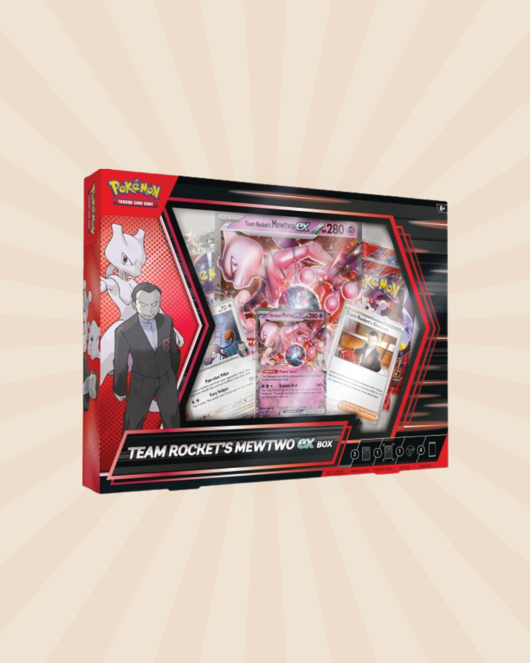 In de Team Rocket’s Mewtwo ex Collection Box ontdek je de sinistere kracht van Giovanni’s ultieme wapen, met een reeks exclusieve foil promokaarten en een indrukwekkende oversized kaart die elke collectie domineert.