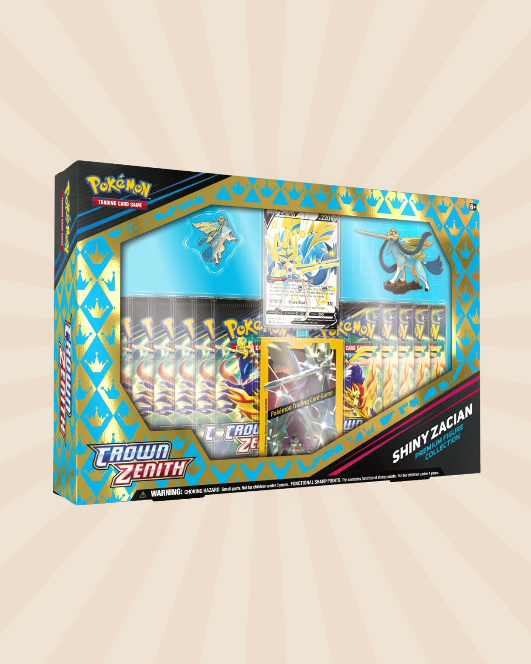 Zacian straalt in zijn Shiny-vorm met een majestueuze uitstraling, vergezeld door exclusieve promokaarten, premium accessoires en een indrukwekkend display-figuur. Elke booster uit de Crown Zenith-serie biedt nieuwe kansen op schitterende kaarten en onvergetelijke pulls.